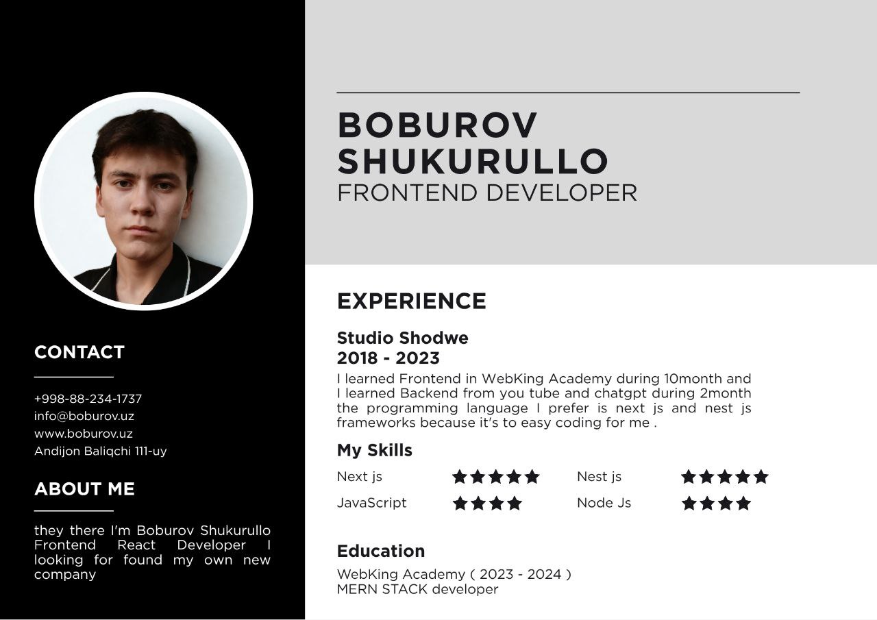 NestJS va Frontend texnologiyalar bo‘yicha kuchli fullstack dasturchi.